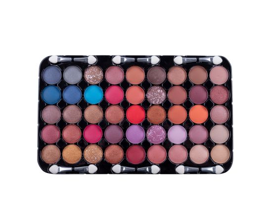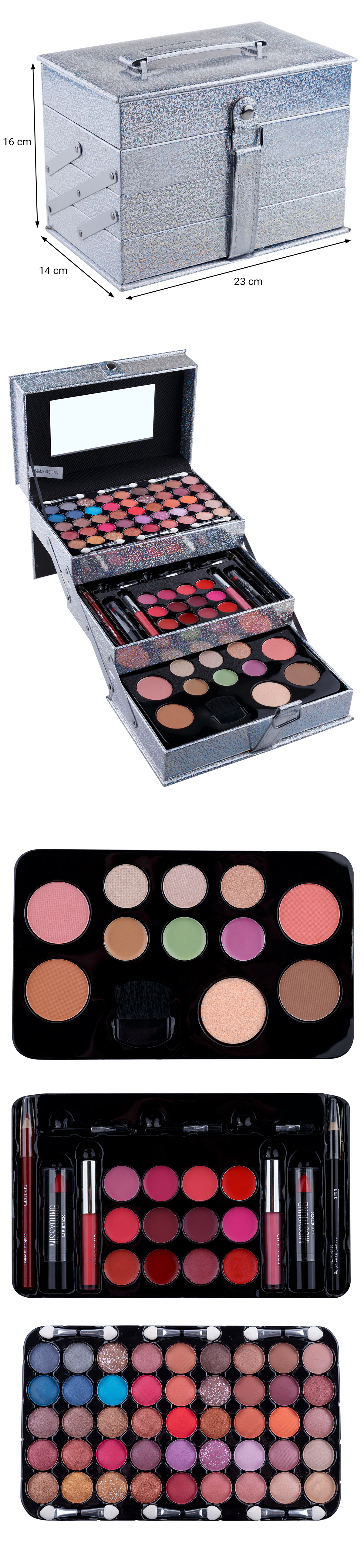 45 нюанса руж в интензивни, неутрални и наситени цветове. Силно пигментиран и издържа на клепачите цял ден. Сенките са колкото перлени, толкова и в матови нюанси. Множеството цветове, налични в този комплект за грим, ще ви накарат да опитате стотици комбинации от гримове.