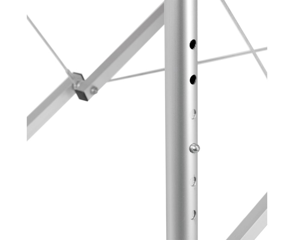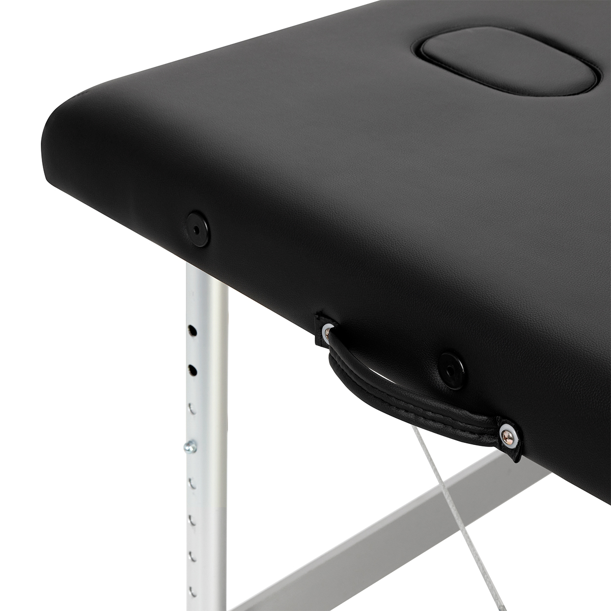 The height of the table can be adjusted to the height and individual needs of the person performing the treatment using a telescopic adjustment from 62 to 80 cm with a locking mechanism. Each of the table's aluminum legs consists of two tubes that can be freely moved relative to each other after being unlocked. The Fast Lock mechanism holds the elements in the selected position once the lock is placed in the appropriate hole. Additionally, the frame structure is stabilized with metal cables, which makes the massage table solid and perfect for a wide range of services.