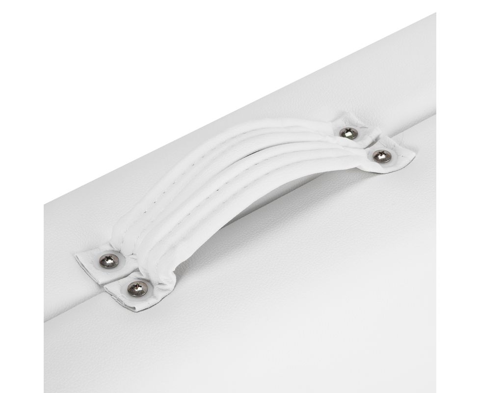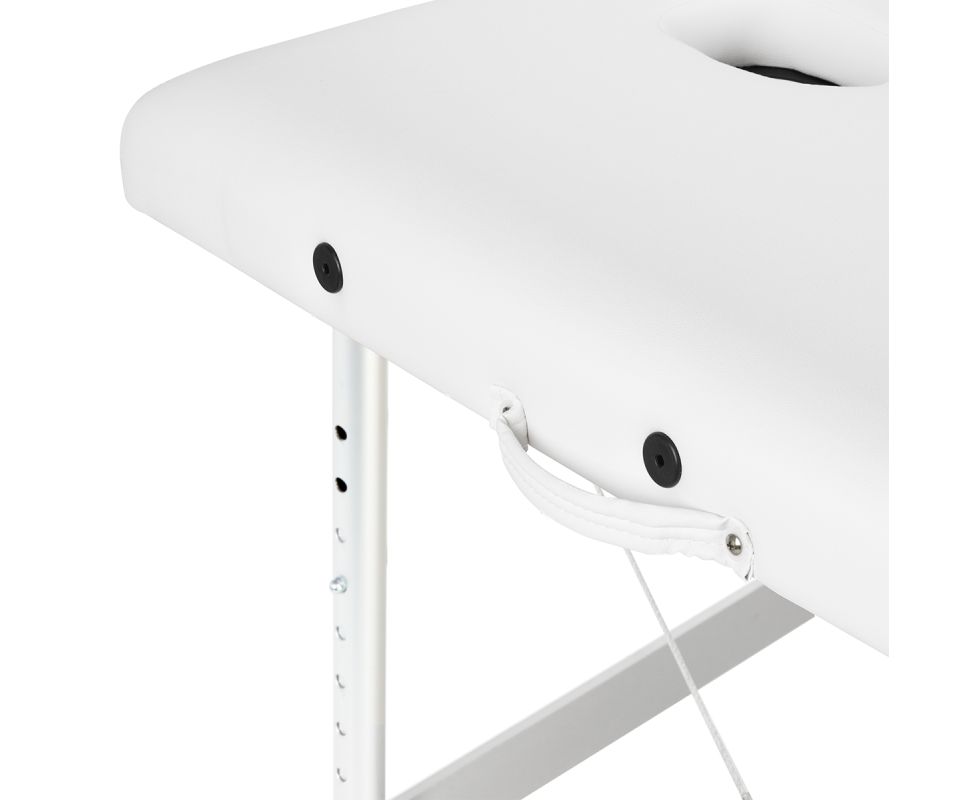 The height of the table can be adjusted to the height and individual needs of the person performing the treatment using a telescopic adjustment from 62 to 80 cm with a locking mechanism. Each of the table's aluminum legs consists of two tubes that can be freely moved relative to each other after being unlocked. The Fast Lock mechanism holds the elements in the selected position once the lock is placed in the appropriate hole. Additionally, the frame structure is stabilized with metal cables, which makes the massage table solid and perfect for a wide range of services.