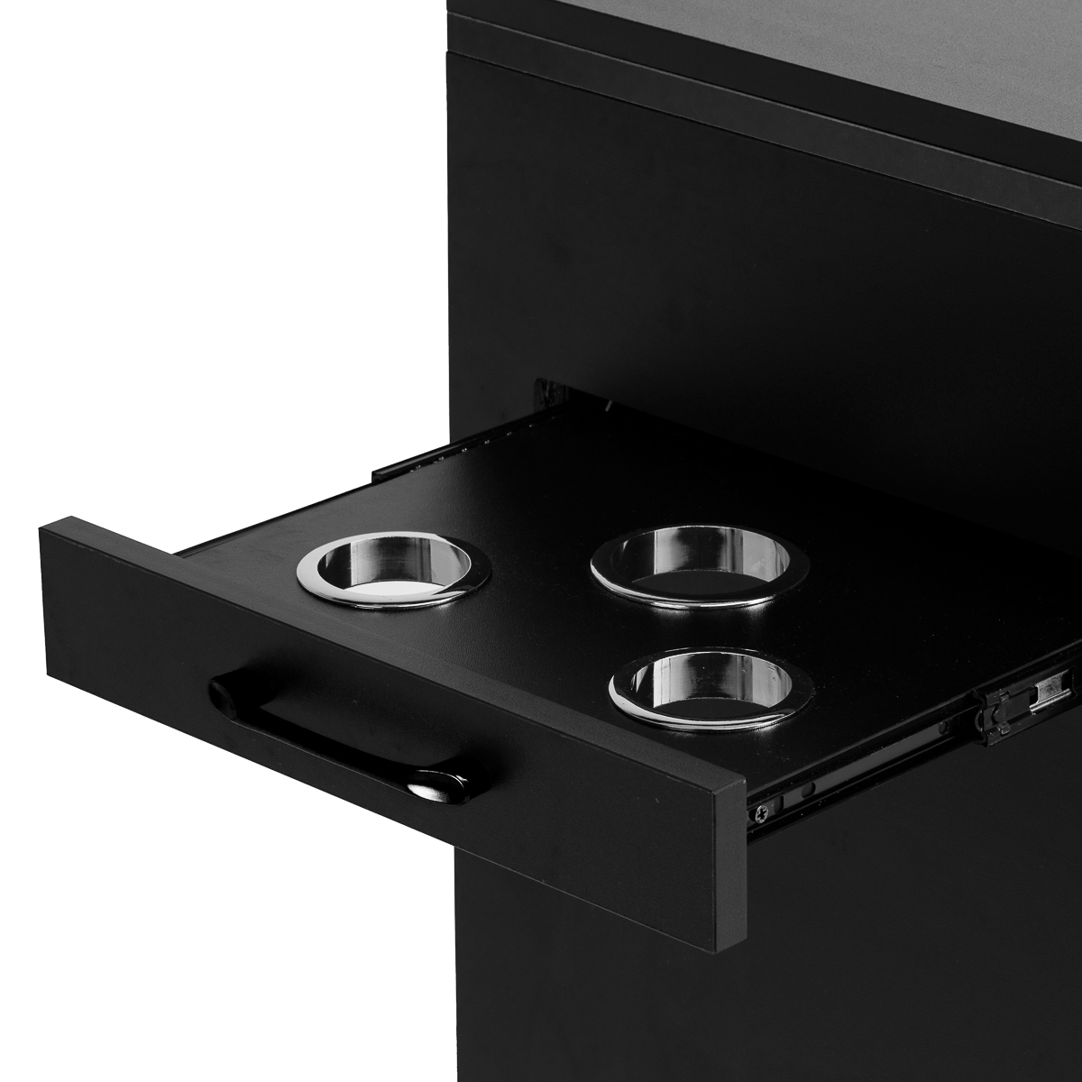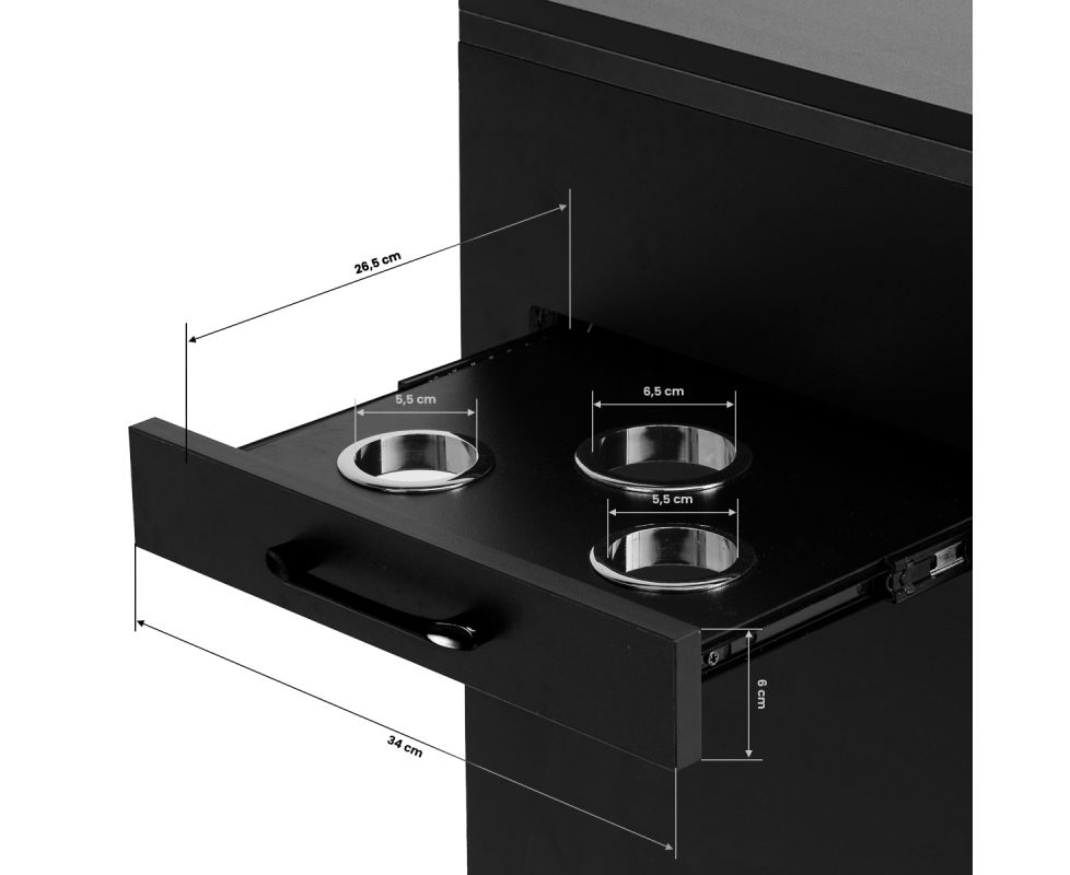 The helper has an additional side pull-out drawer with metal tool holders. The three openings are perfect for holding hair dryers, curling irons, straighteners or brushes, allowing you to conveniently store your equipment during treatment. This solution provides free access to the most necessary tools without putting them away on the work surface.