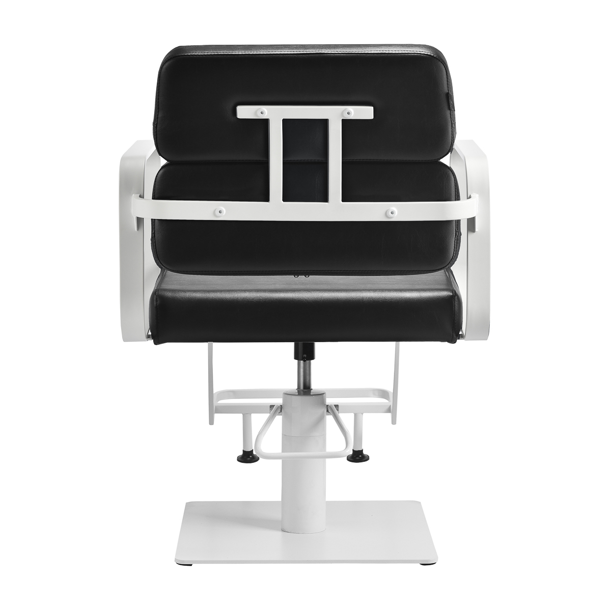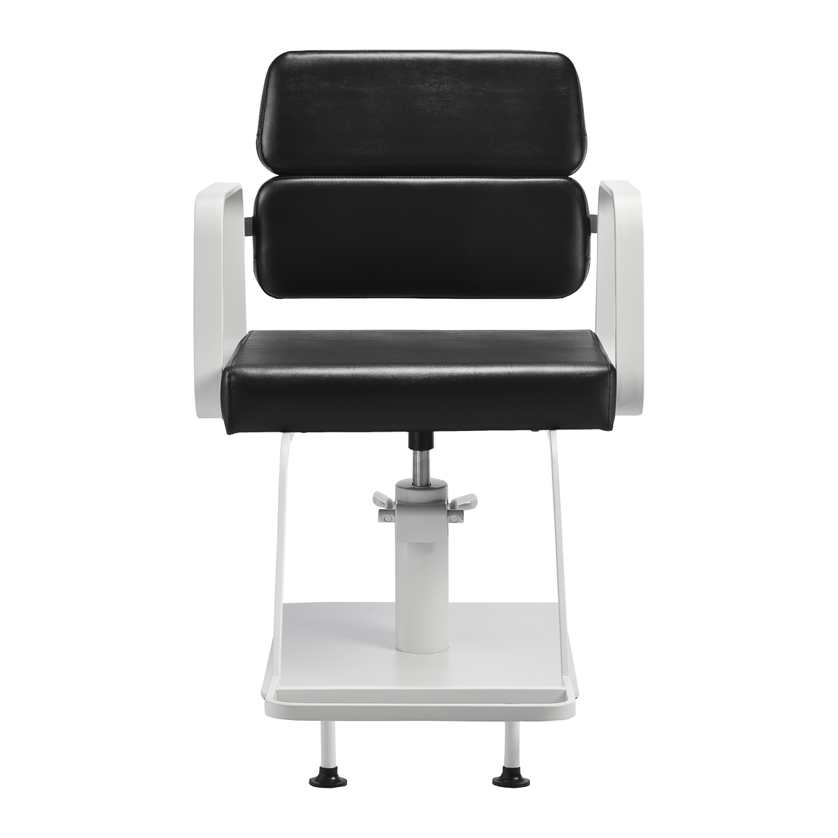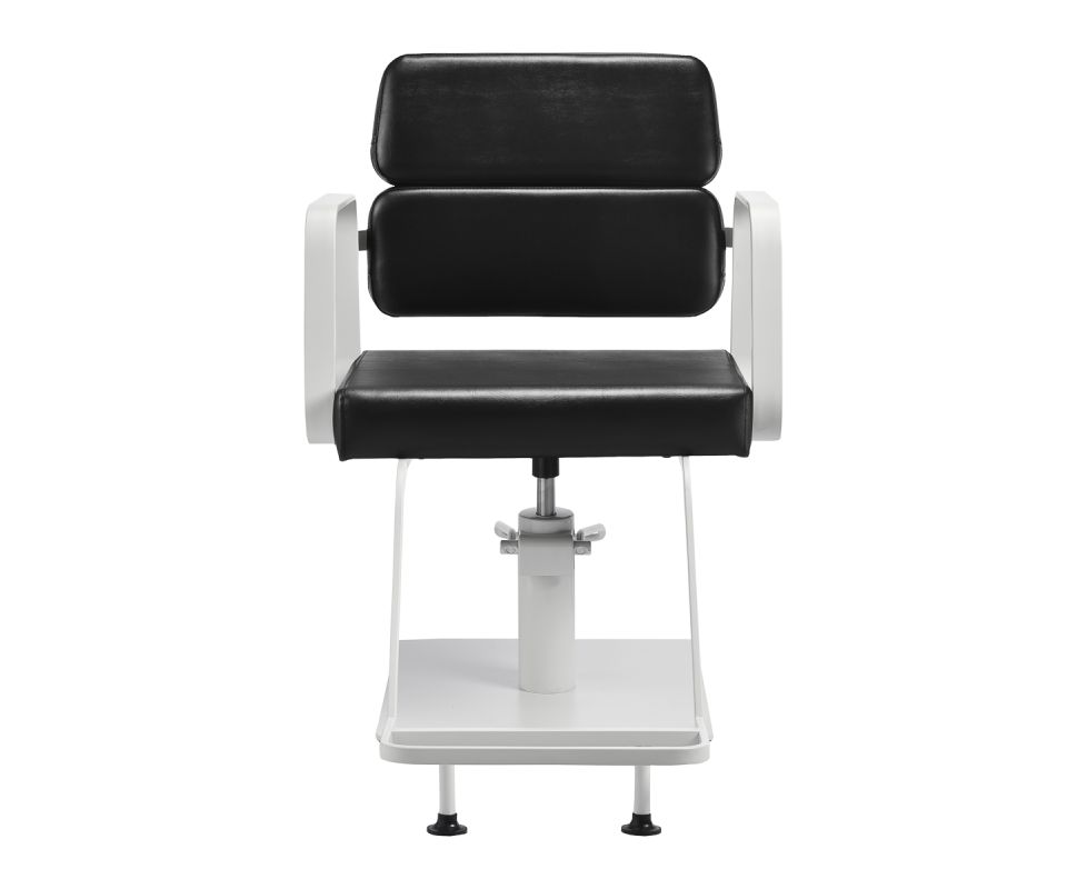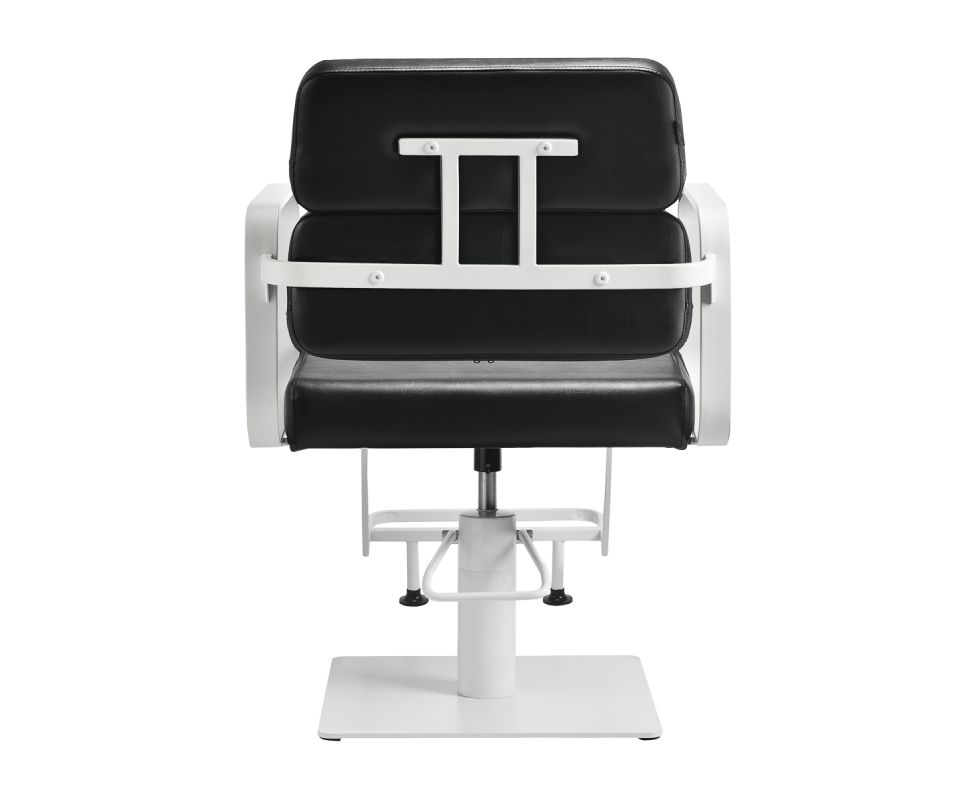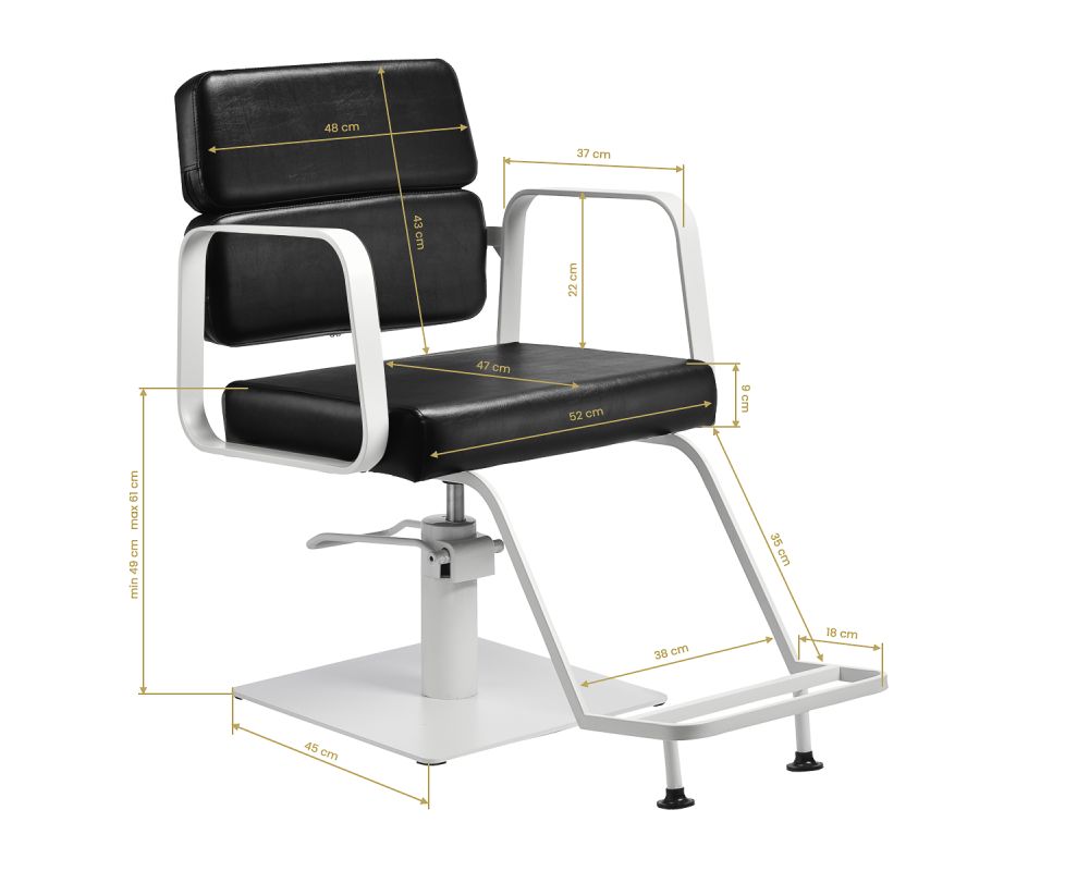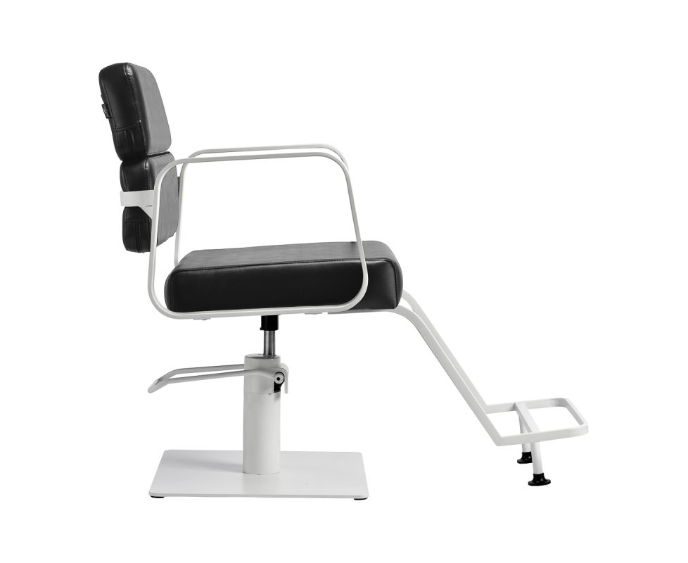 The full rotation mechanism of the chair makes the hairdresser's work more effective and comfortable. A solid, flat, square-shaped base guarantees stability during use. The matte-finished, smooth surface gives the element an elegant look and makes it easy to keep clean. A comfortable seat with foam filling ensures high comfort of use, even during many hours of treatments. Geometric, metal armrests allow for the correct positioning of the client's shoulders – this means that he does not bury his head in his shoulders or slouch – which makes it much easier to perform precise treatments, including haircuts. A stylish footrest dedicated to this model provides stable support for the user's feet.