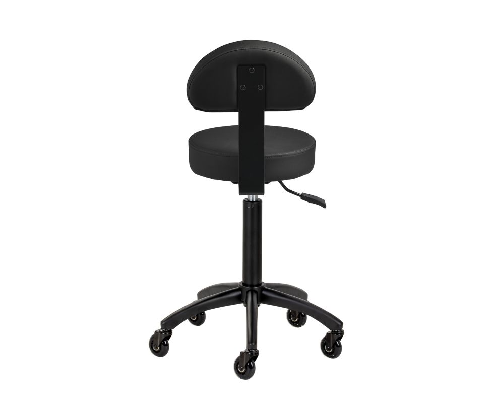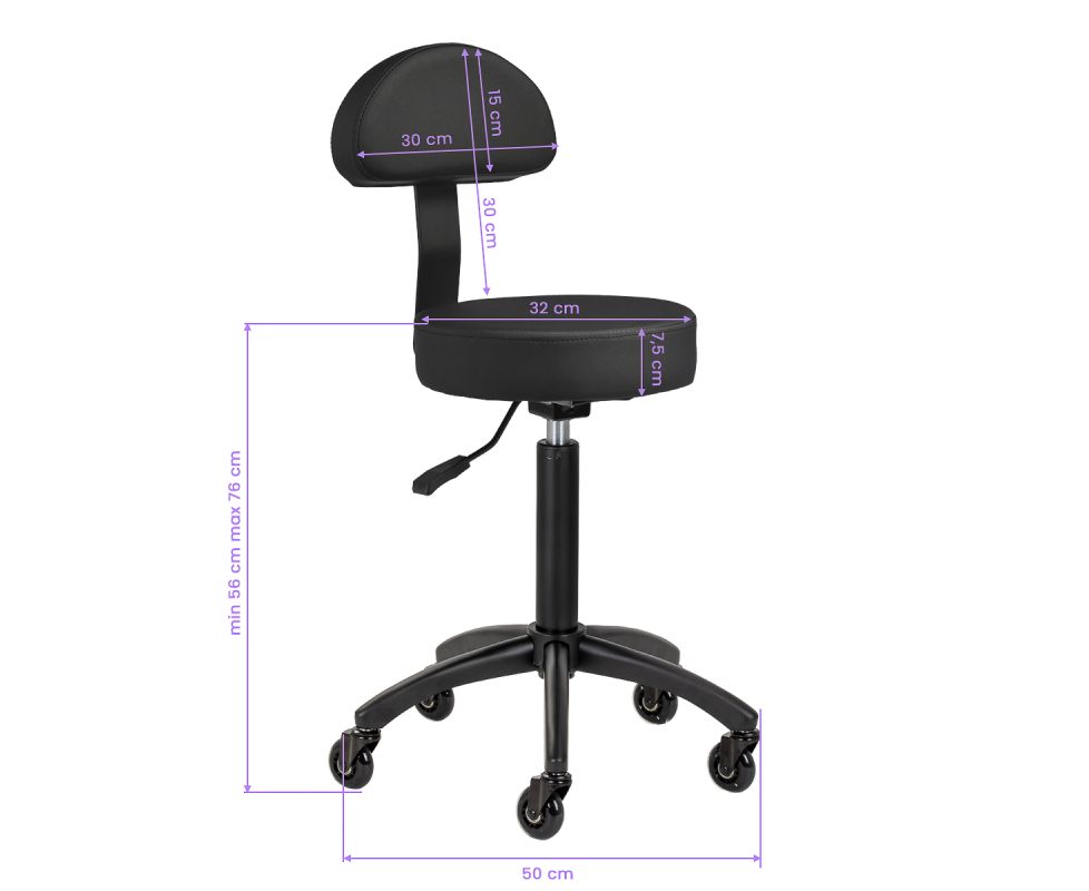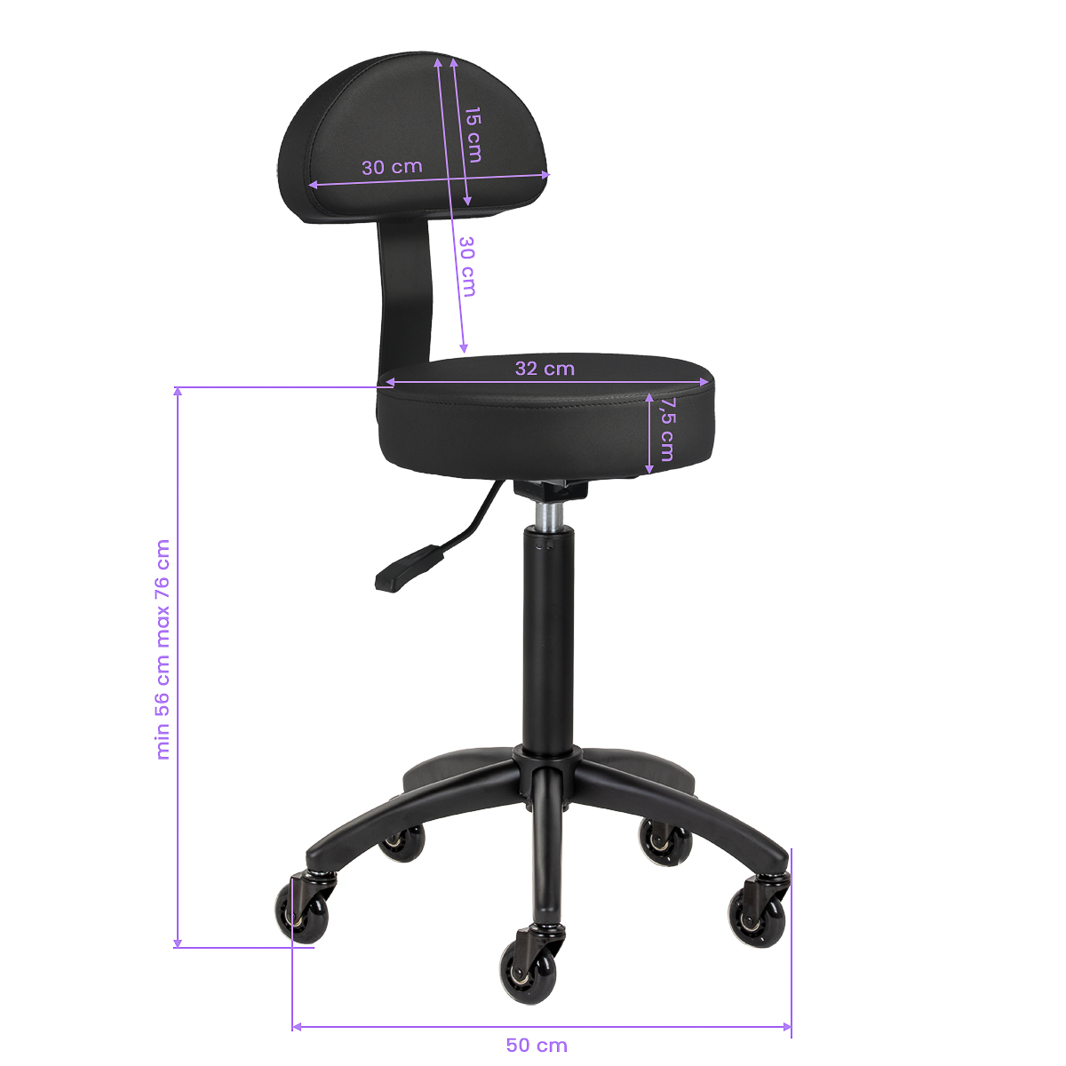 The seat height adjustment ranges from 56 to 76 cm, allowing for a customised position to the individual needs of the professional while performing services. The backrest supports the spine, ensuring comfort even during prolonged work. The full rotation mechanism increases freedom of movement, resulting in greater comfort and efficiency. Mobility is ensured by Roll Speed wheels with an iron core and polyurethane (PU) coating, which combine smooth movement with exceptional wear resistance. The use of ABEC-7 bearings makes the stool easy to move, significantly facilitates manoeuvring.