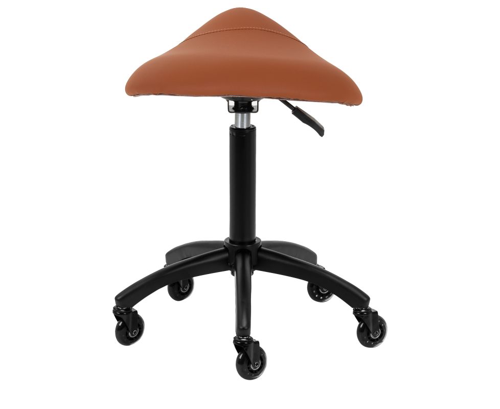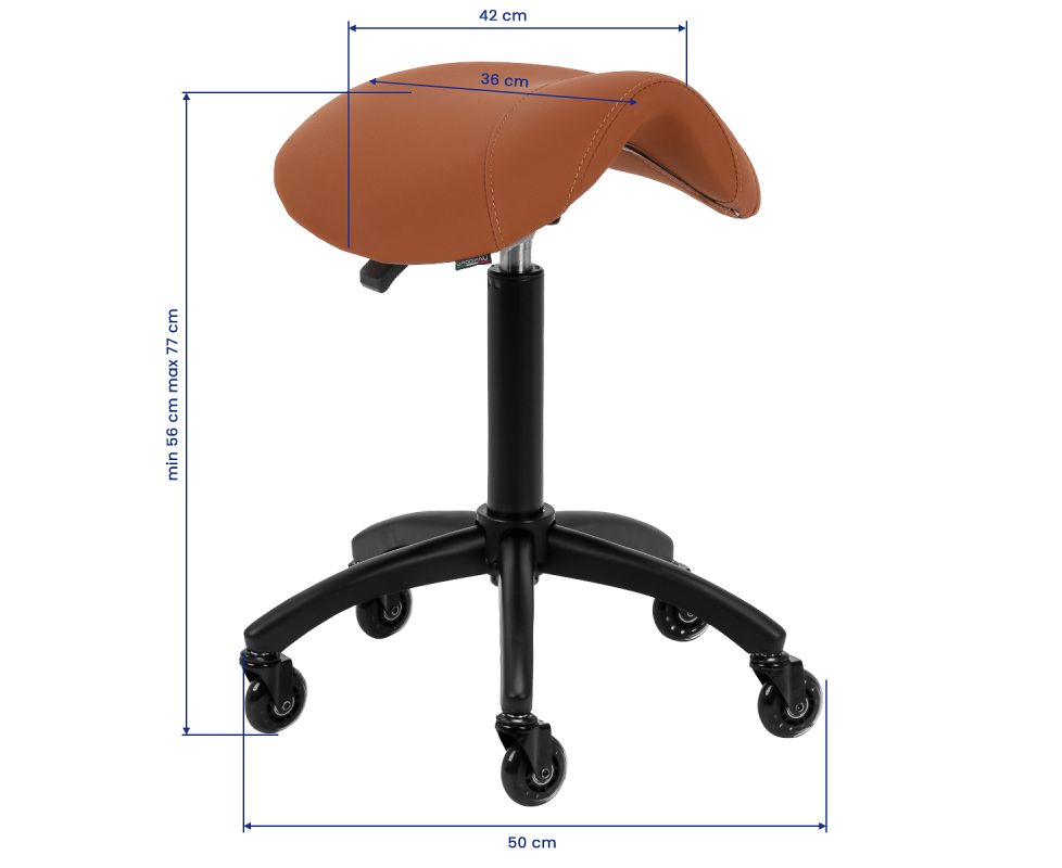 Seat height adjustment in the range of 56-77 cm allows the specialist to adjust their position while performing services. The saddle-shaped seat, filled with deformation-resistant foam, guarantees comfort and ergonomics. The full rotation mechanism makes work more efficient and convenient. Mobility is ensured by Roll Speed wheels with an iron core and polyurethane (PU) coating, which combine smooth movement with exceptional wear resistance. The use of ABEC-7 bearings makes the stool easy to move, significantly easier to manoeuvre.