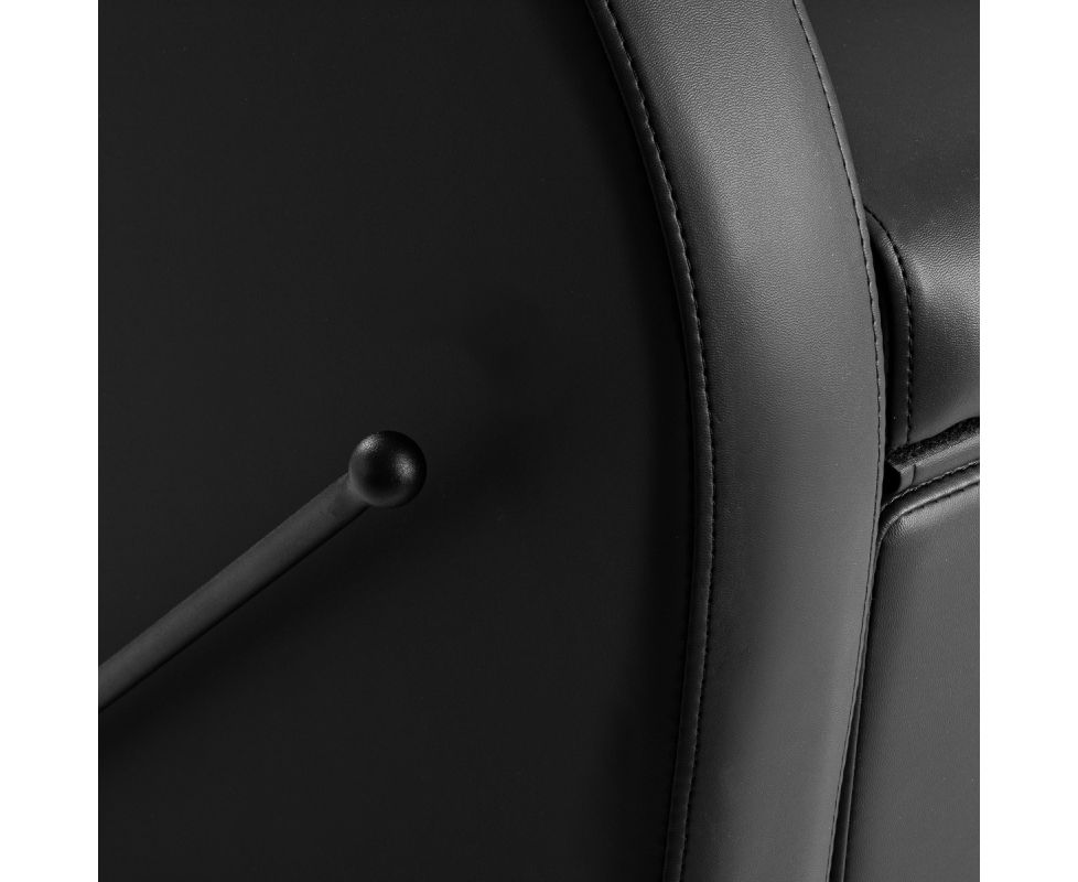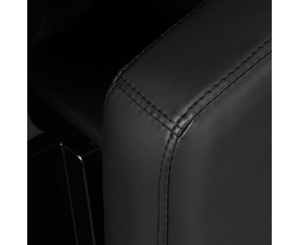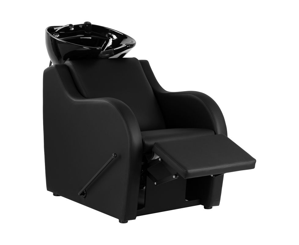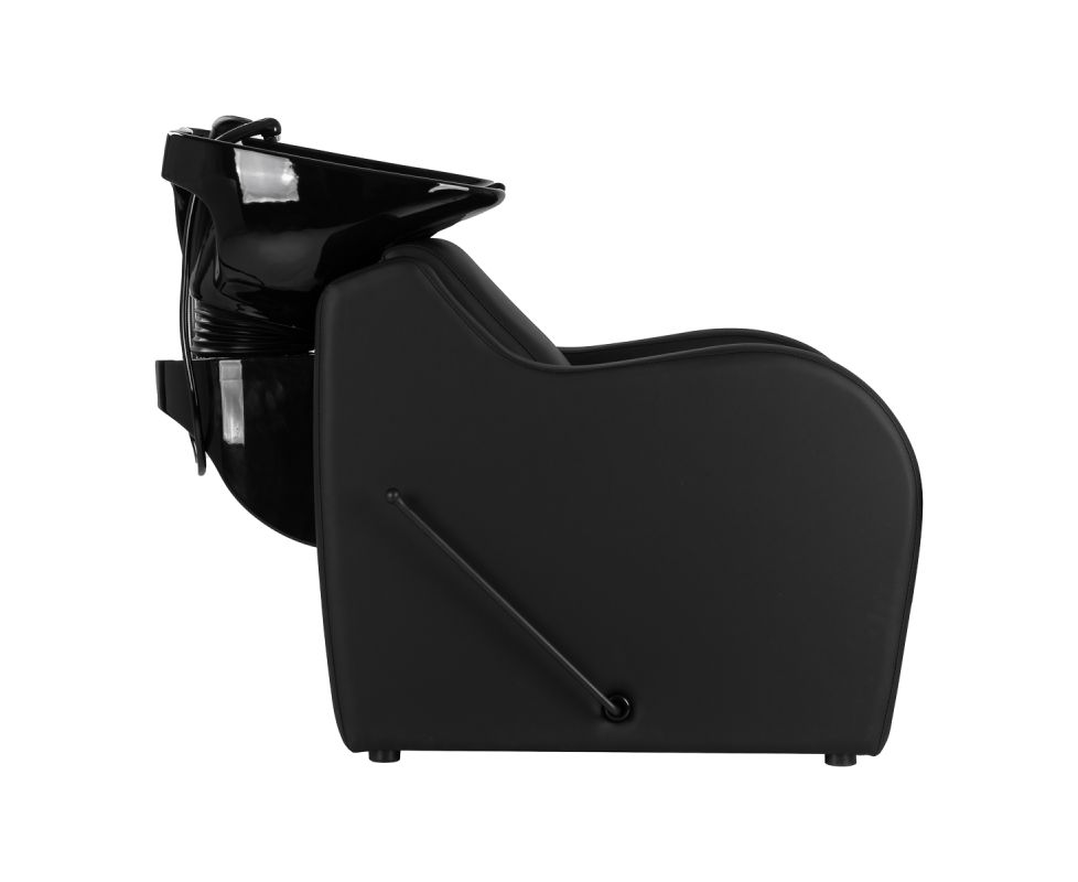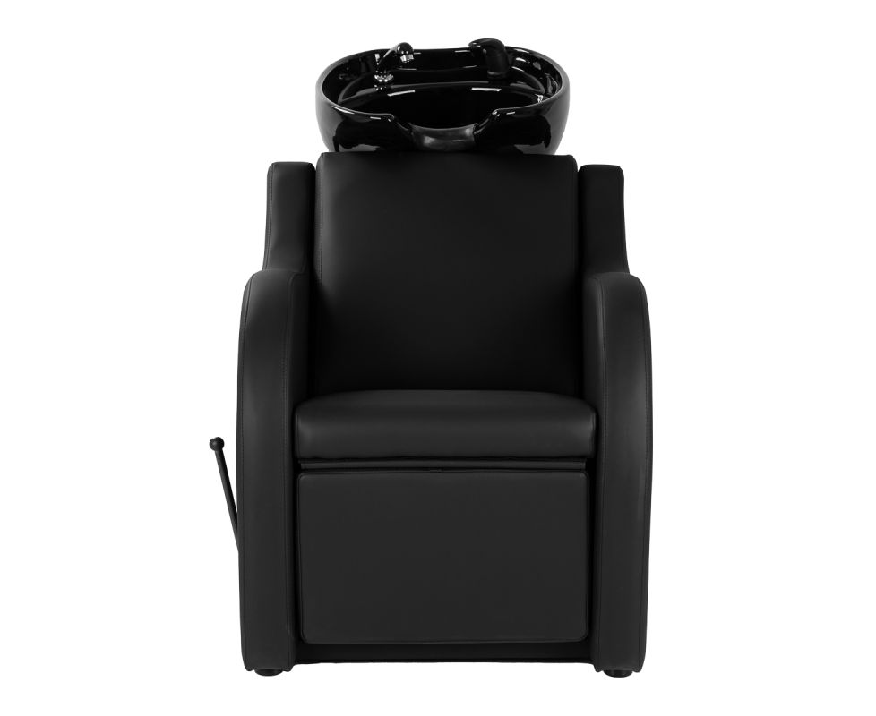 A contoured chair with durable foam padding provides adequate support for the lumbar region, which translates into high comfort of use. Upholstered armrests allow the client's shoulders to be positioned correctly, supporting a comfortable position during the treatment. Soft-to-the-touch synthetic leather in shades of black is distinguished by its durability, ease of cleaning and resistance to moisture. The modern form of the wash unit adds a distinctive style to the interior. The set includes full fittings in black – a faucet, a shower head and dedicated hoses – creating a ready set for everyday work.