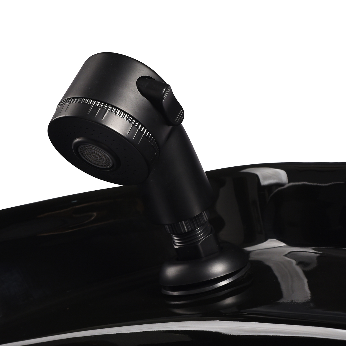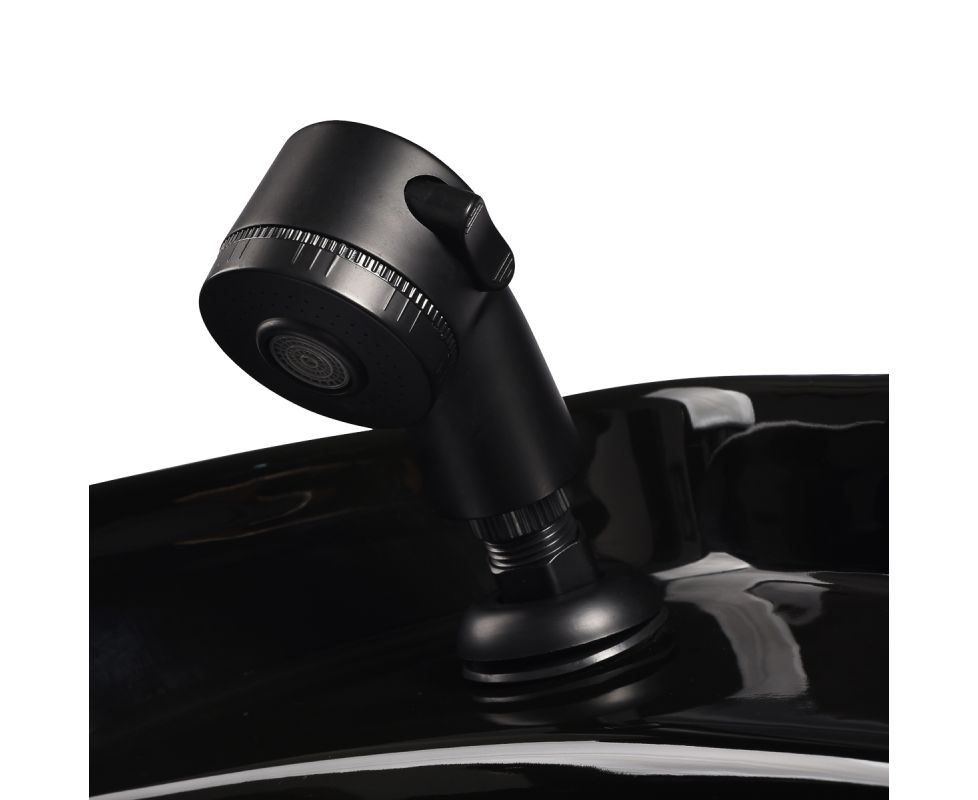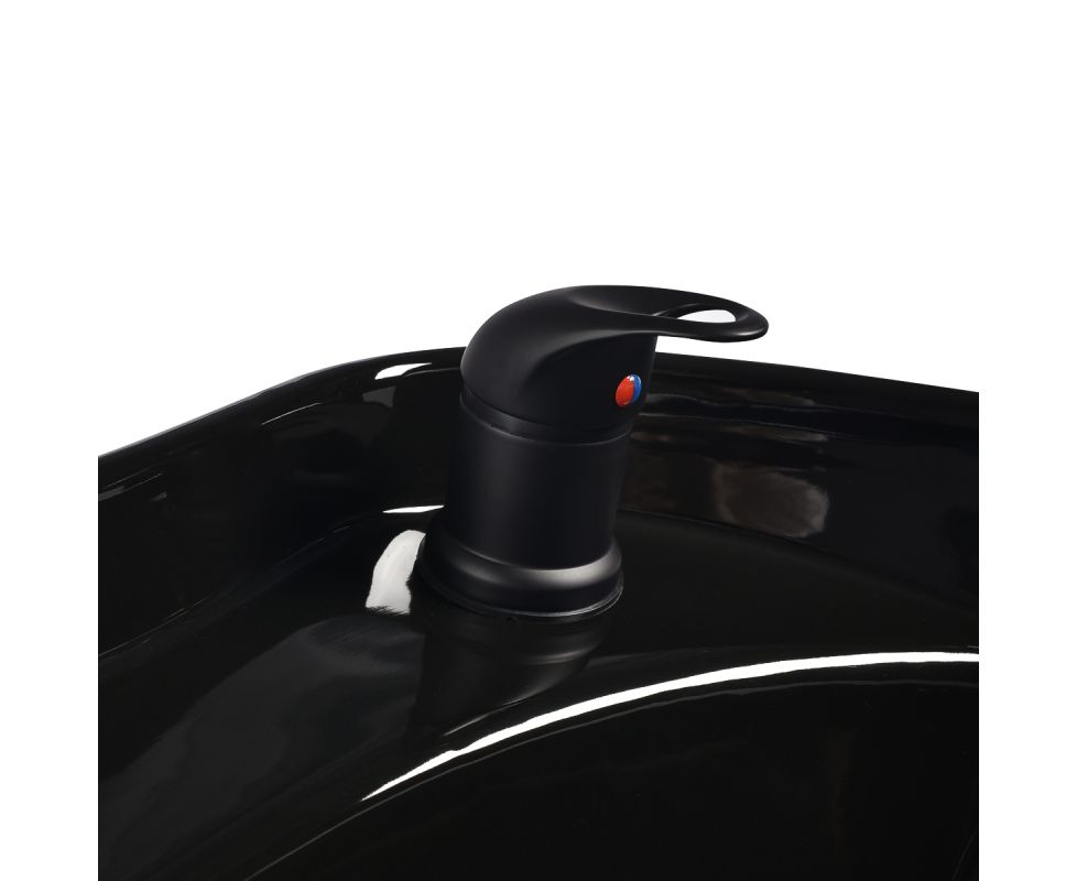 The appropriate depth of the white ceramic washbasin bowl prevents excessive splashing of water or products used during treatments. This allows for comfortable and effective performance of a wide range of services. The angle of the bowl can be adjusted, making it easy to adapt to individual needs. The high quality of the materials used makes the washbasin durable, resistant to discoloration and scratches, and very easy to clean. A properly profiled collar and inclined backrest provide support and comfort when washing the hair, and thanks to the comfortable black plastic overlay, the customer will not feel the unpleasantness of the cold ceramic surface.