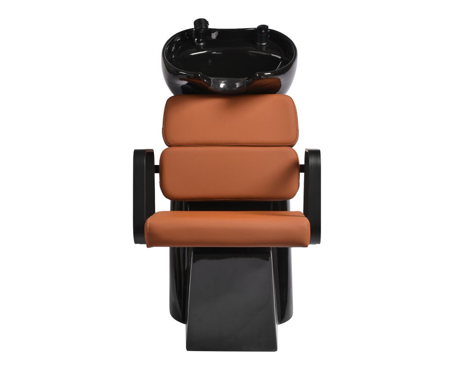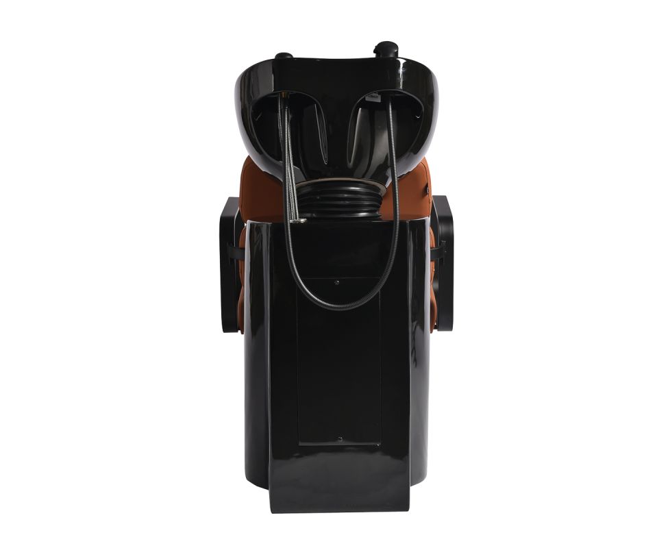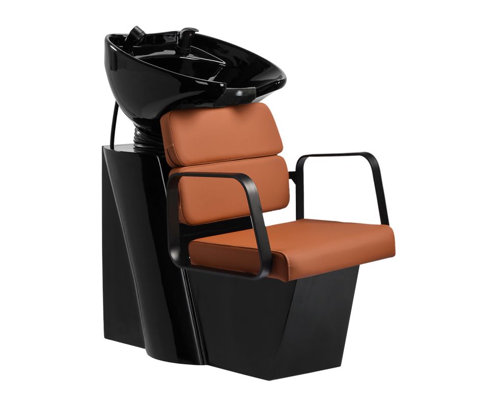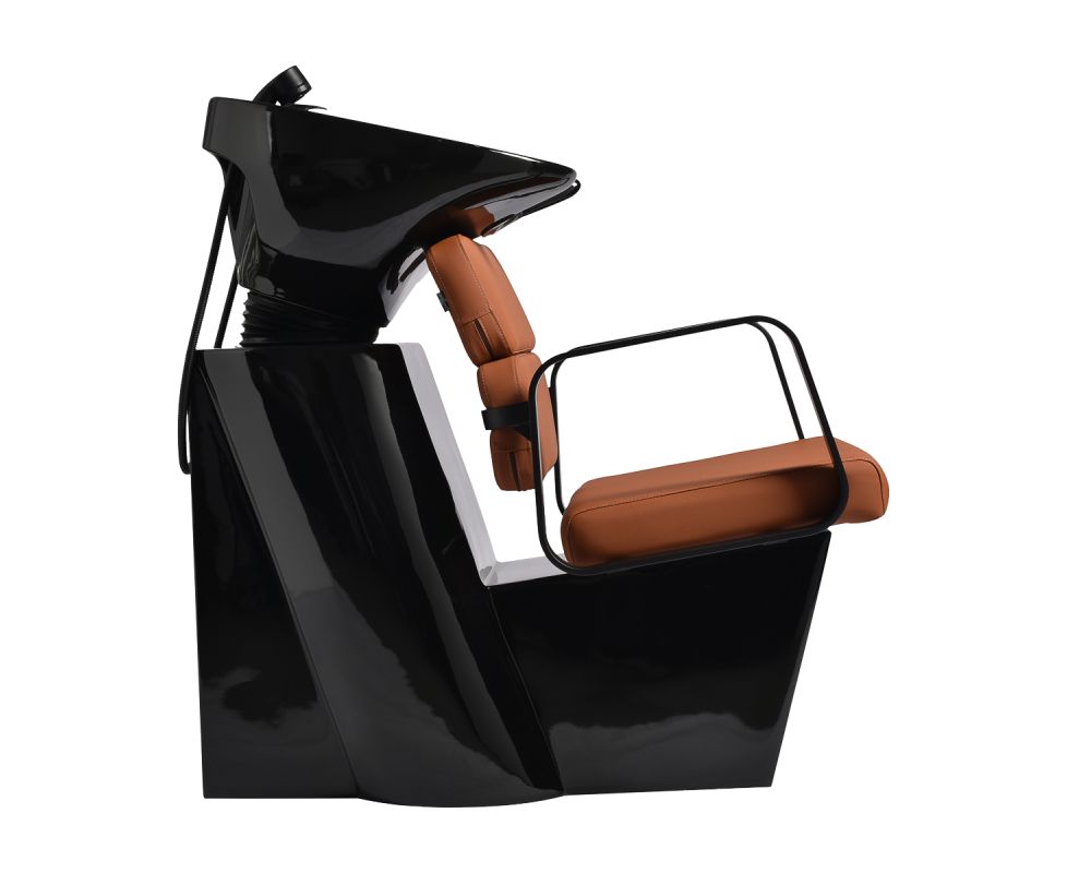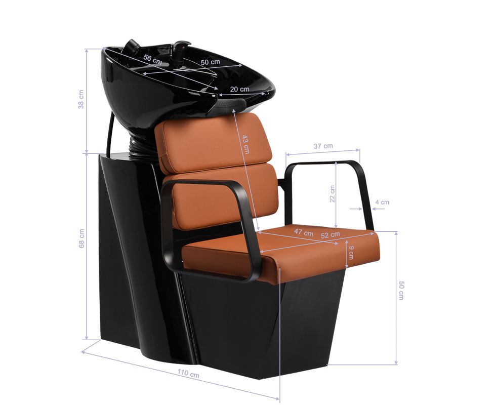 The profiled chair provides adequate lumbar support and, therefore, high comfort of use. Metal armrests in shades of black with a geometric shape allow for the correct positioning of the customer's shoulders. Filling with durable, deformation-resistant foam and upholstery made of pleasant-to-touch synthetic leather in shades of orange ensure the durability of the furniture, ease of cleaning and comfortable use for a long time. The original, elegant appearance of the hair wash unit gives the interior a unique expression. The set includes complete fittings in shades of black, including a faucet, a shower head and dedicated hoses to provide a complete set of tools for work.