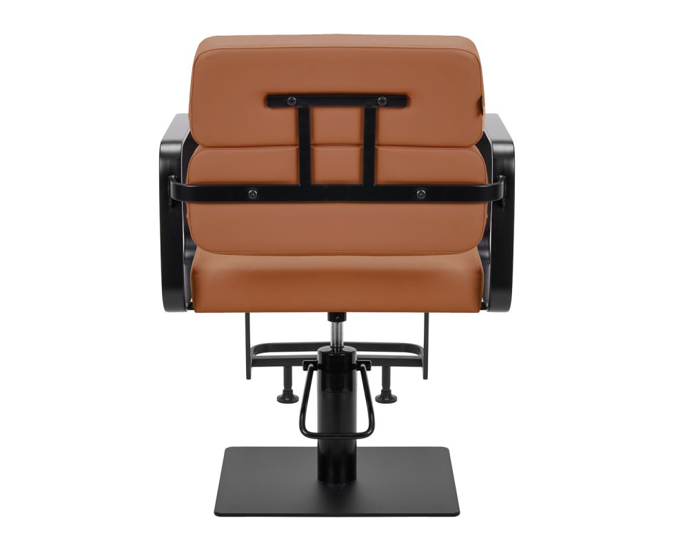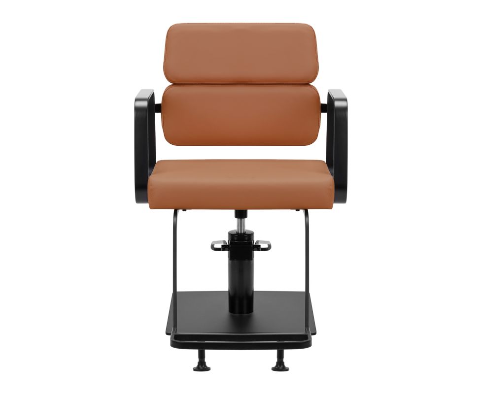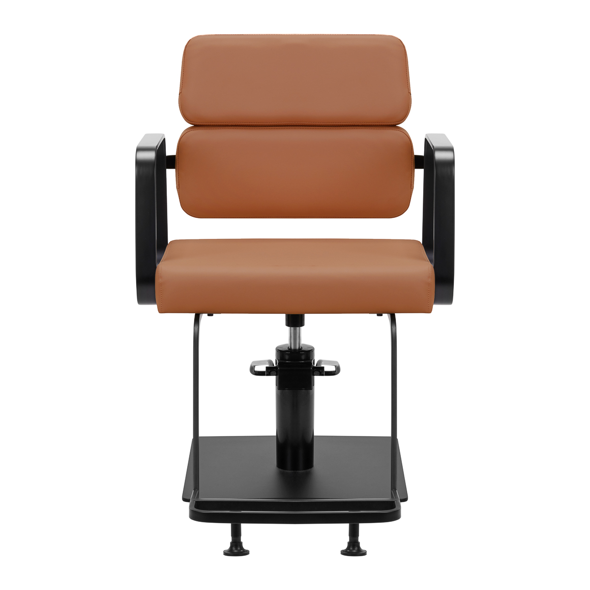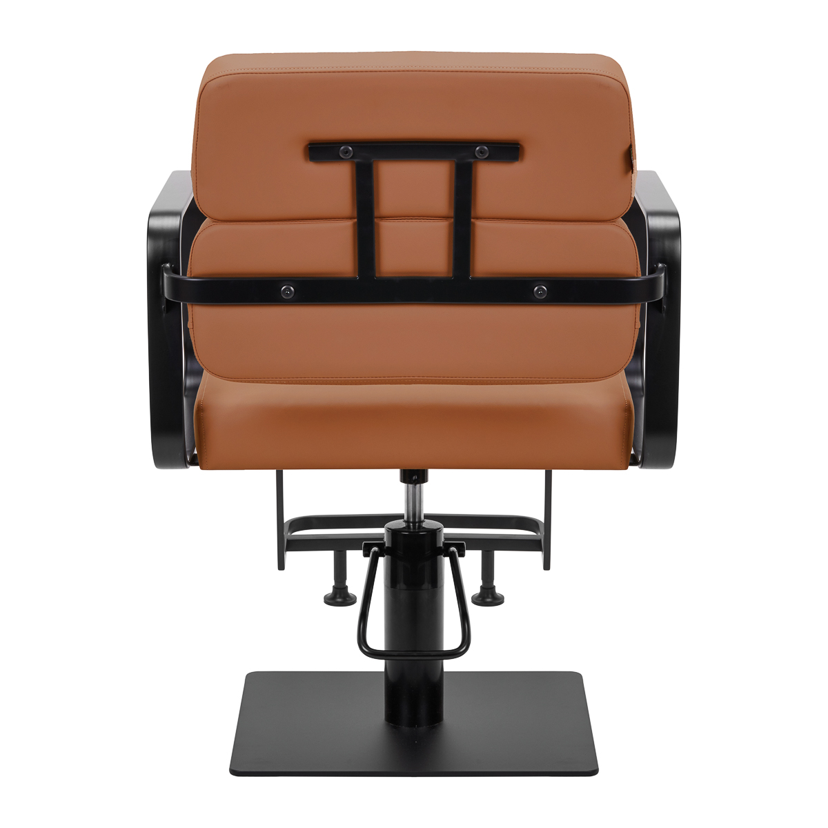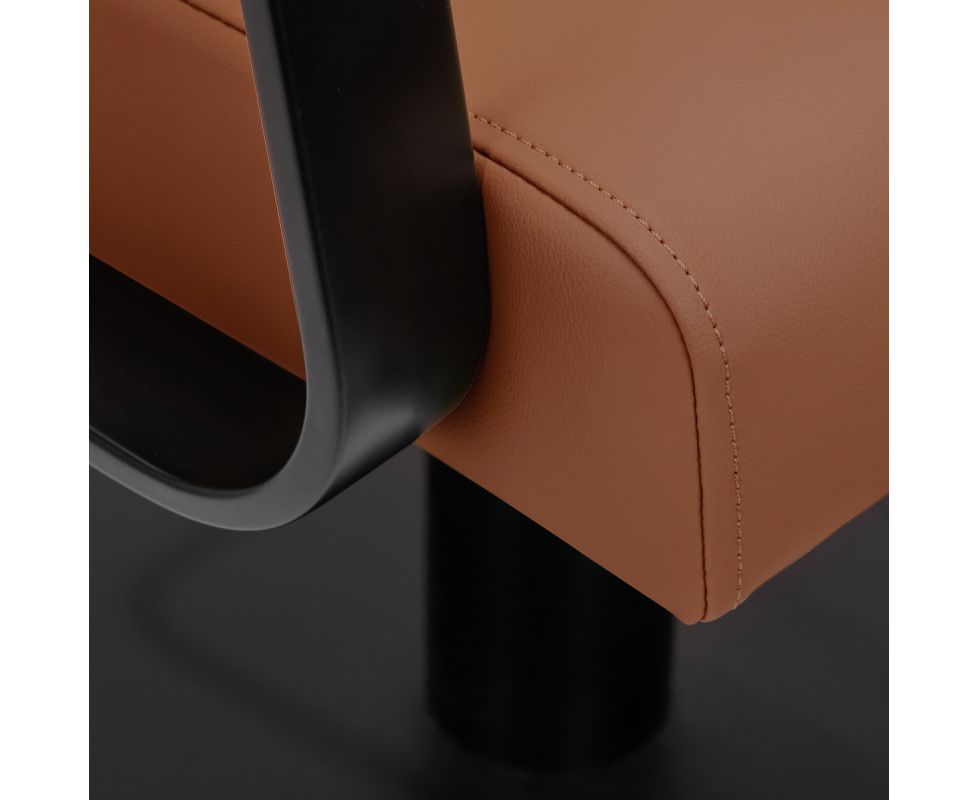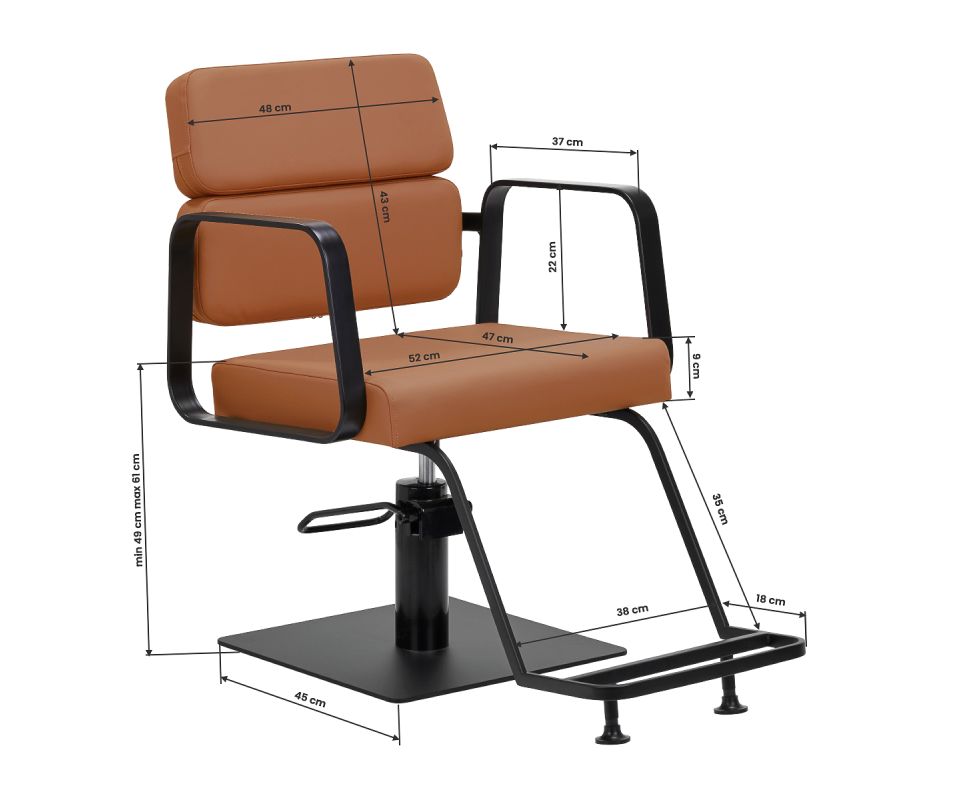 The full rotation mechanism of the chair makes the hairdresser's work more effective and comfortable. A solid, flat, square-shaped base guarantees stability during use. The matte-finished, smooth surface gives the element an elegant look and makes it easy to keep clean. A comfortable seat with foam filling ensures high comfort of use, even during many hours of treatments. Geometric, metal armrests allow for the correct positioning of the client's shoulders – this means that he does not bury his head in his shoulders or slouch – which makes it much easier to perform precise treatments, including haircuts. A stylish footrest dedicated to this model provides stable support for the user's feet.