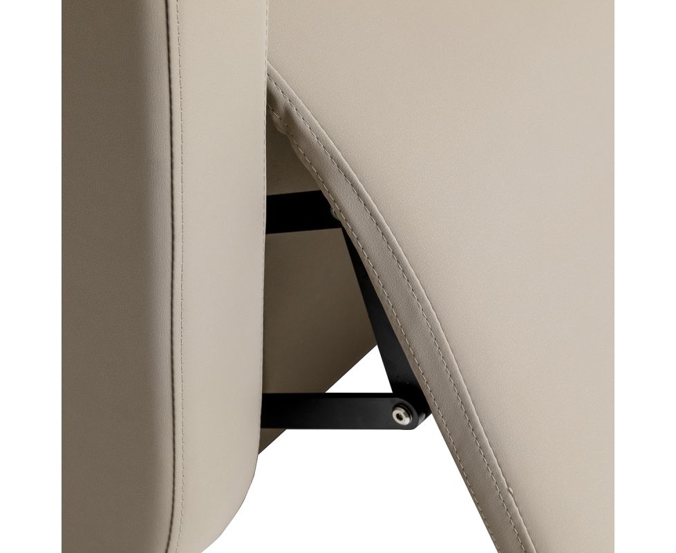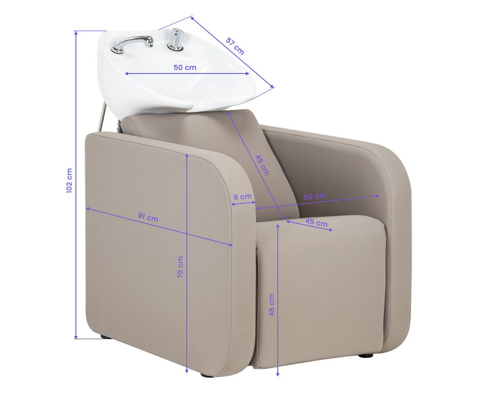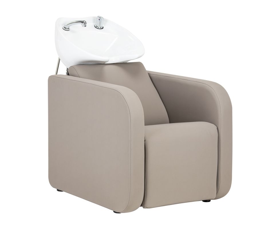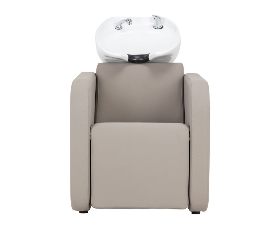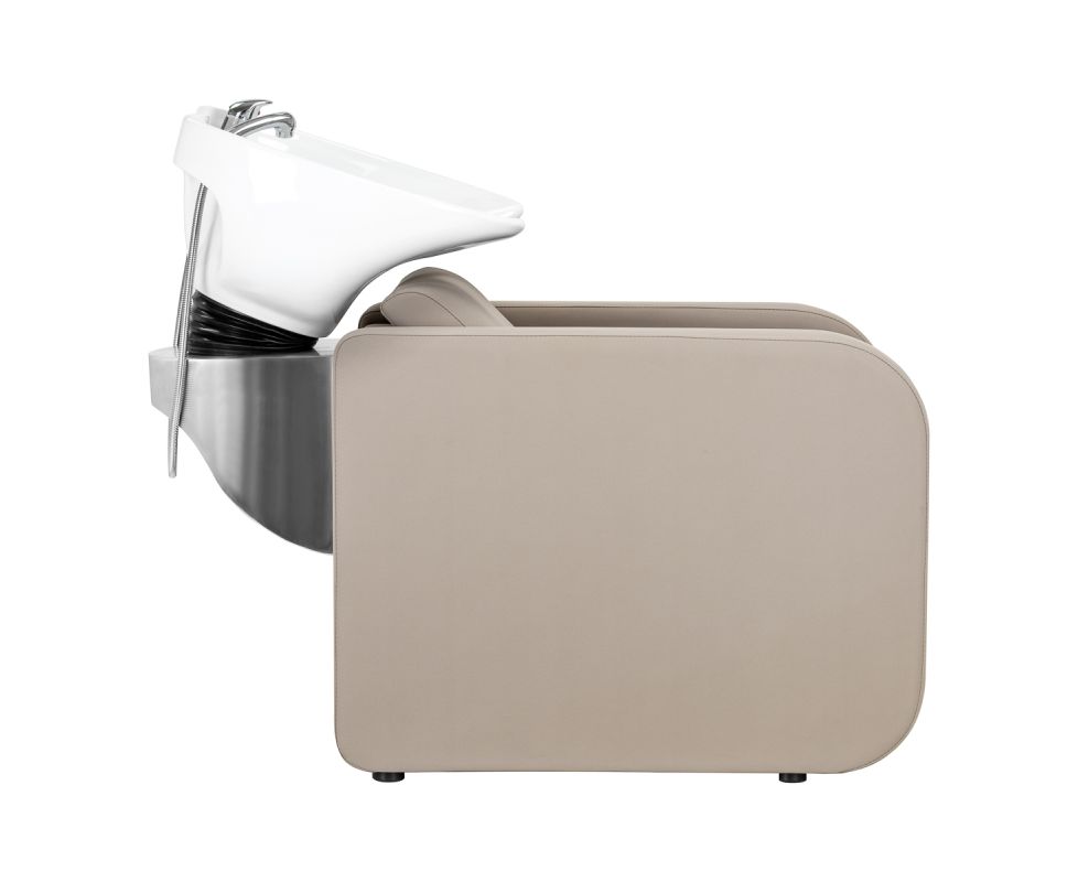 The Gabbiano Sylvia hairdressing wash station has been designed with the aim of comfortably performing care or colouring treatments in mind, as well as providing the client with a comfortable position during longer procedures. It catches the eye with its simplicity and geometric form, while the perpendicular lines of the seat and armrests give it a modern feel. The backrest placed at an optimal angle promotes excellent support for the spine. The appropriately profiled seat filled with durable foam ensures high comfort of use, and the upholstered armrests allow for the correct positioning of the client's shoulders. The synthetic leather cover in shades of beige guarantees many years of durability and ease of cleaning. The elegant, minimalist look of the wash station gives the interior a unique touch. The set includes complete fittings in shades of chrome, including a faucet, shower head and dedicated hoses to provide a complete set of tools for work.