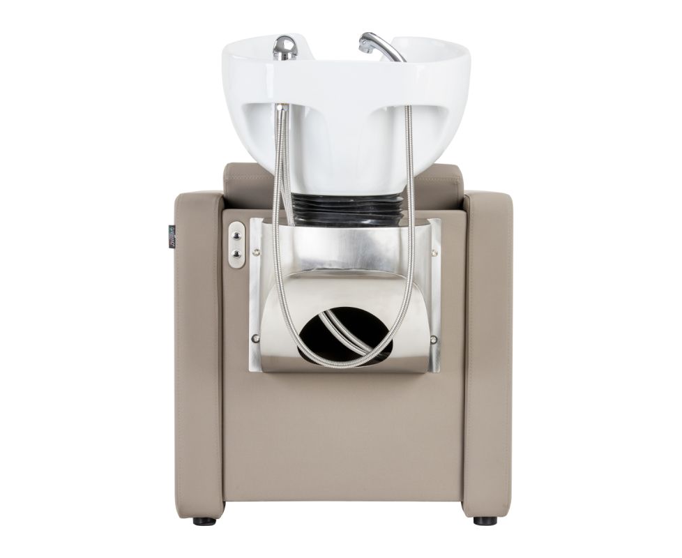 The wash unit is equipped with a mixer tap, providing constant access to hot and cold water. This allows easy adjustment of the temperature to the client's preferences. A dedicated place for hanging the handset makes work easier, and the chrome-plated plug with a special strainer allows you to control water flow and maintain high hygiene standards in the salon. The water connection is located inside the column under the washbasin, which efficiently hides all pipes, while the easy-to-remove panel provides convenient access if needed. The chair is profiled to ensure comfort during various treatments, and the footrest guarantees excellent leg support. The combination of functionality and conveniences makes working in the hair salon even more comfortable.