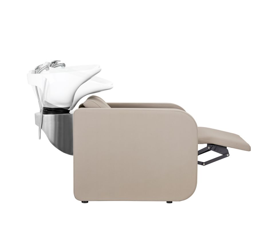 The footrest adjustable with an electric actuator allows for an ergonomic position adjusted to the client's needs. This reduces muscle tension, which ensures comfort even during longer treatments. The angle of inclination is controlled using buttons located on the back of the chair, raising or lowering the footrest. This solution not only provides exceptional comfort but also high functionality, making the wash unit perfectly meet the expectations of even the most demanding users.