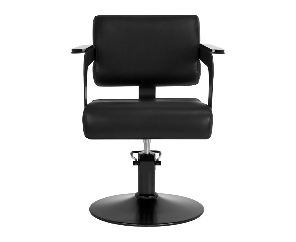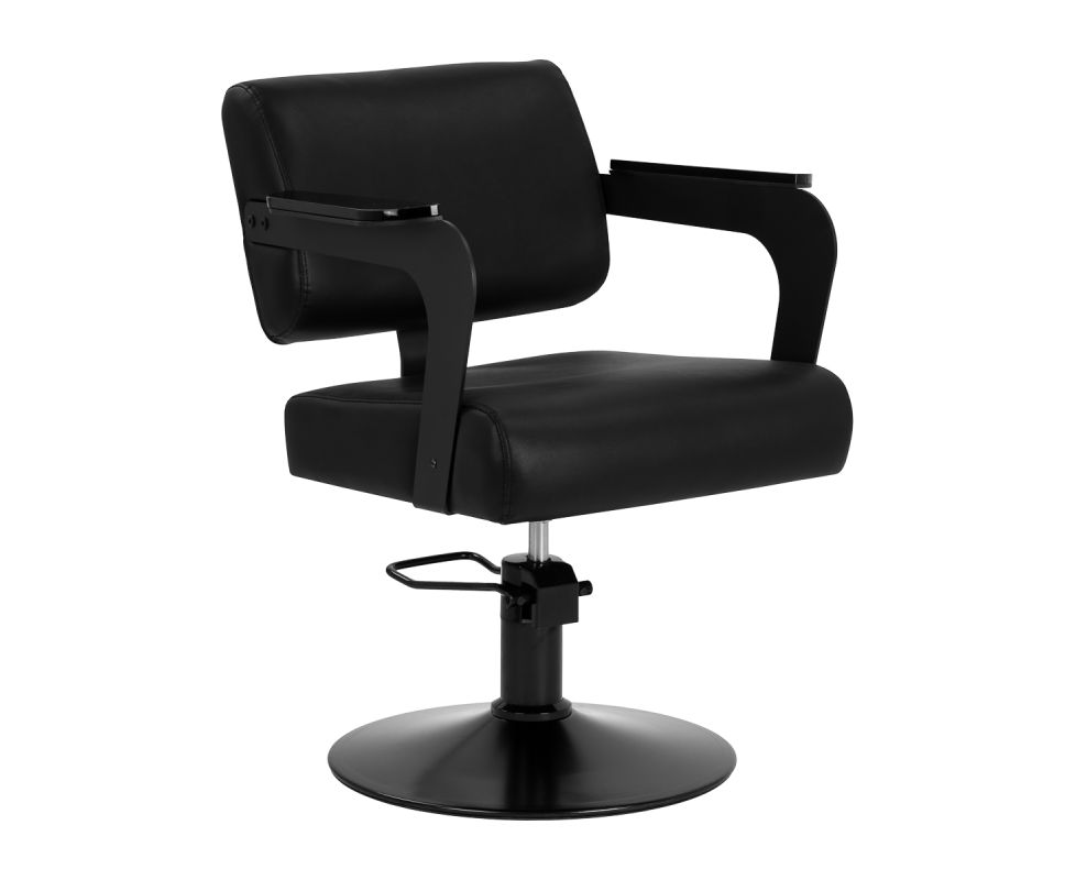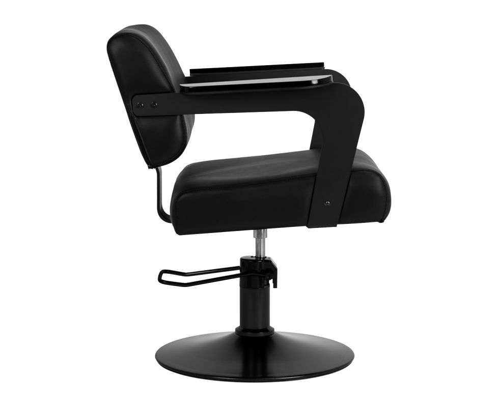 The full rotation mechanism improves the hairdresser's work and increases freedom of movement during treatments. The solid wheel-shaped base guarantees stability during use. The comfortable seat ensures high comfort of use, even during long hours of treatment. The modern armrests are made of a combination of metal and acrylic with a semi-transparent finish. The visible structural elements give the chair an original character. The appropriate height of the armrests promotes the natural positioning of the client's shoulders, which has a positive effect on comfort during haircuts and styling.
