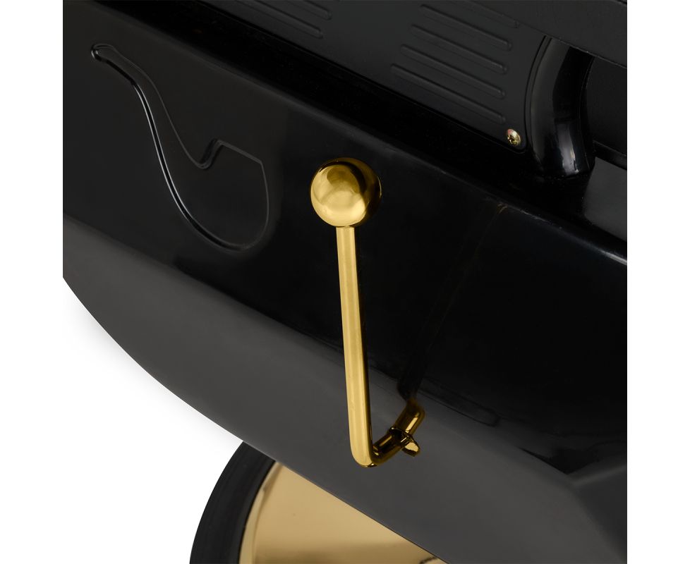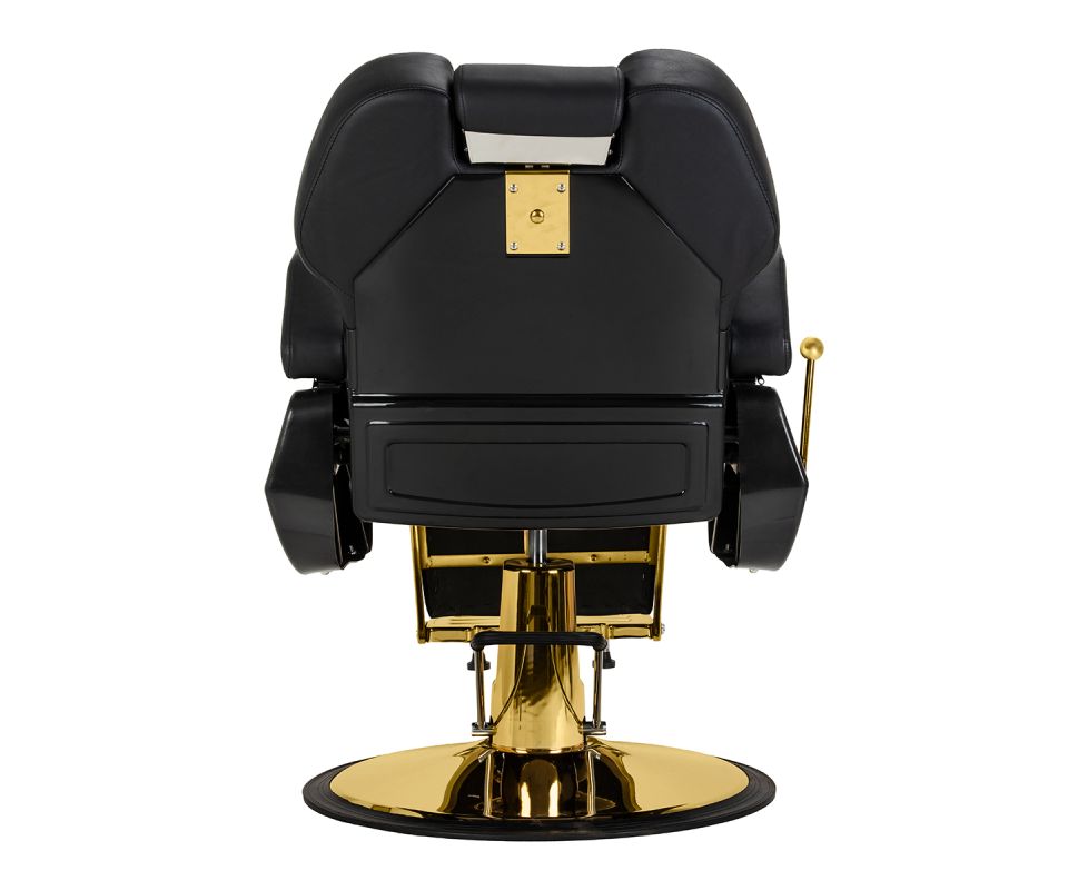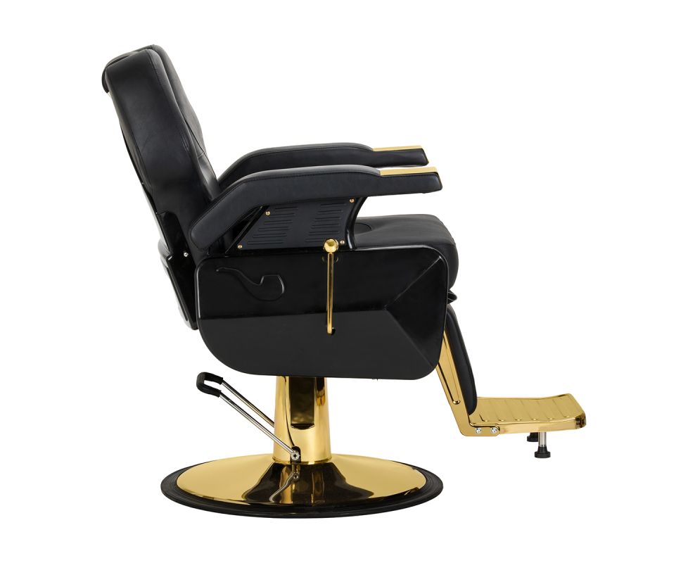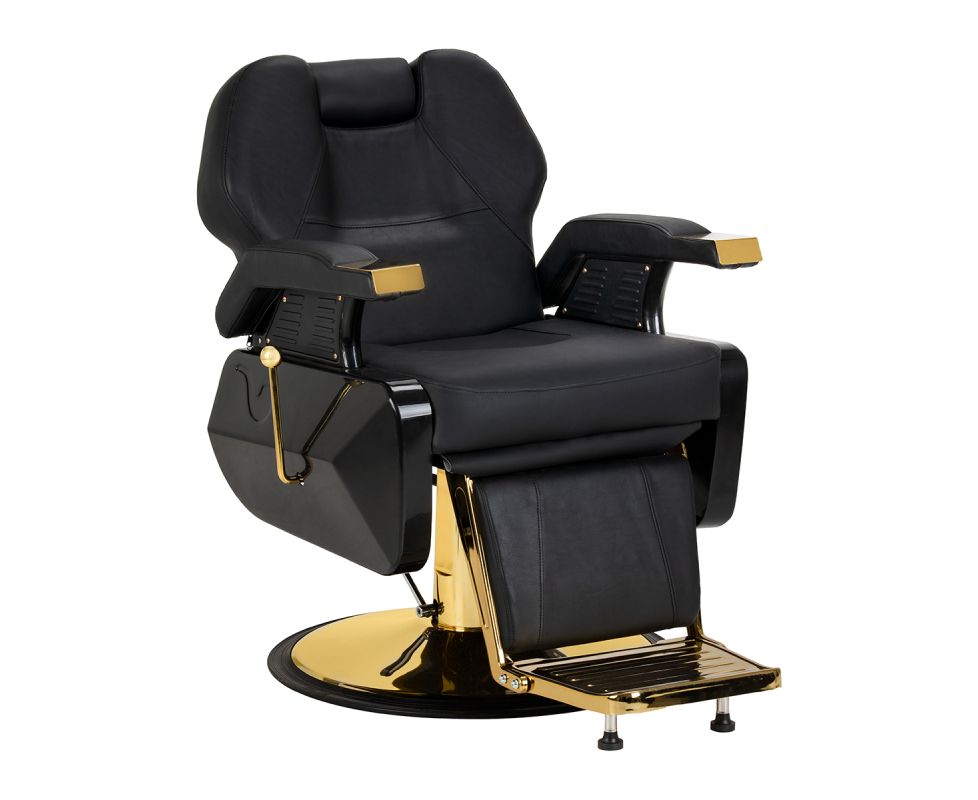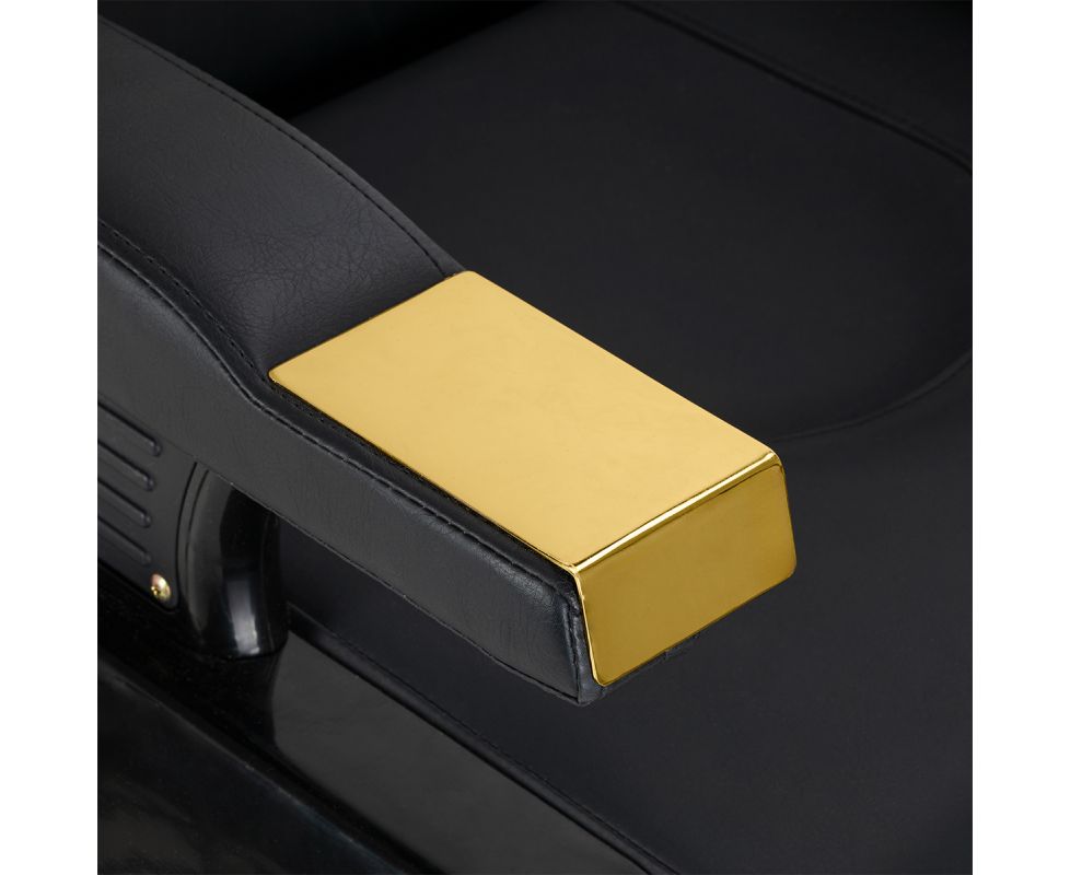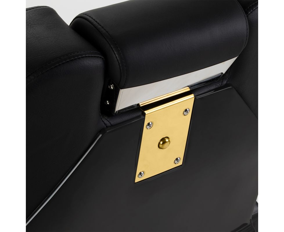 The stable circular base in a gold finish gives the chair a striking appearance and guarantees stability when working. The seat, back and footrest are filled with warp-resistant foam and upholstered in black, pleasant-to-touch synthetic leather for durability and high comfort. The moisture-resistant and easy-care surface makes the chair perfect for everyday use. The gold details and distinctive lines of the upholstery emphasise the exclusive character of the furniture, giving it a modern, slightly automotive style. The elegant design fits perfectly into the décor of barbershops.