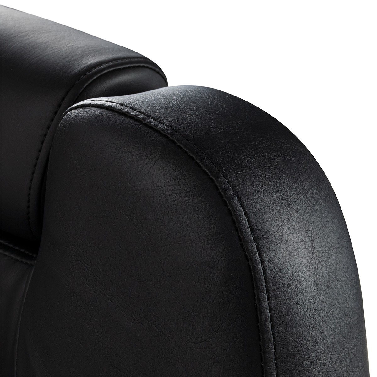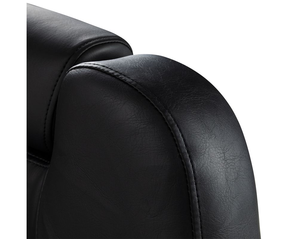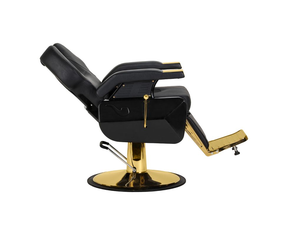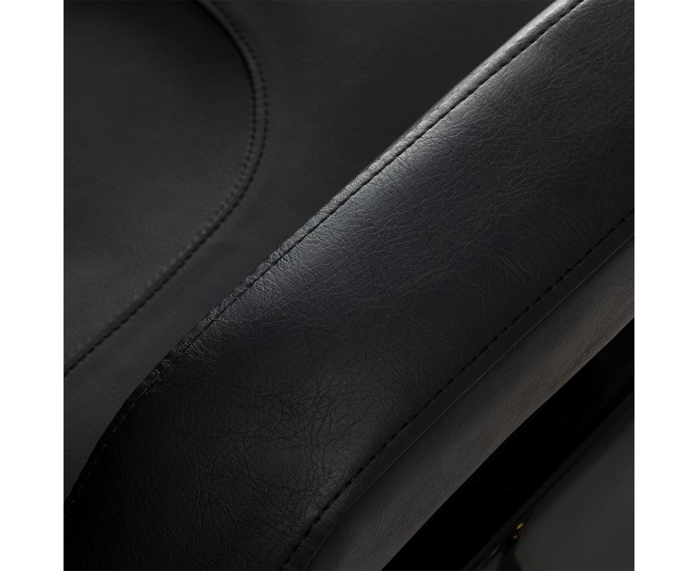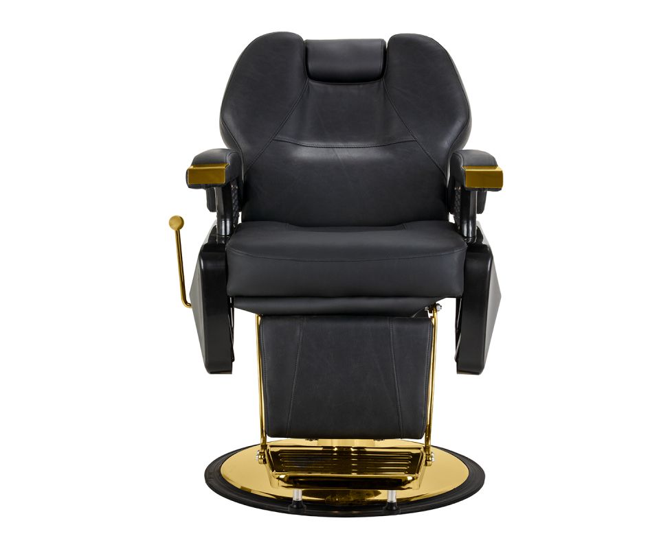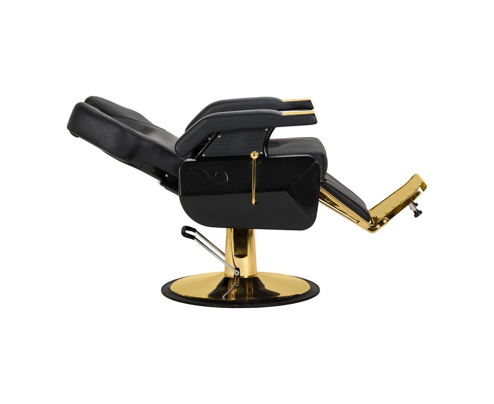 The stable circular base in a gold finish gives the chair a striking appearance and guarantees stability when working. The seat, back and footrest are filled with warp-resistant foam and upholstered in black, pleasant-to-touch synthetic leather for durability and high comfort. The moisture-resistant and easy-care surface makes the chair perfect for everyday use. The gold details and distinctive lines of the upholstery emphasise the exclusive character of the furniture, giving it a modern, slightly automotive style. The elegant design fits perfectly into the décor of barbershops.