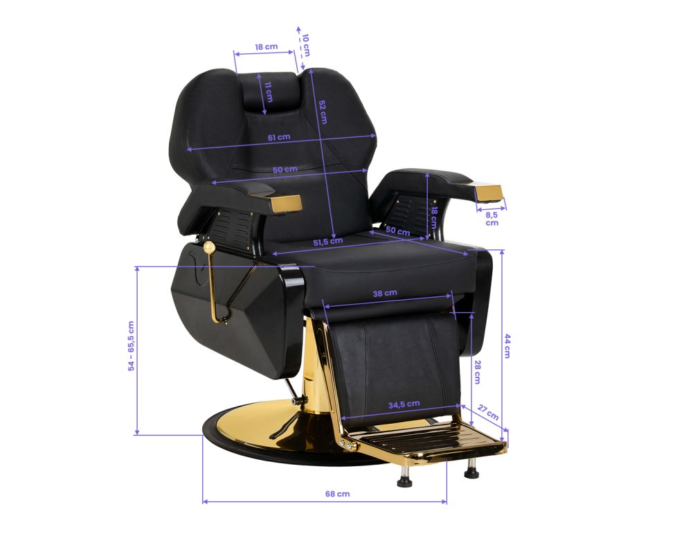 The comfortable seat ensures client comfort during a variety of services. The ergonomic backrest offers excellent back support and allows for a comfortable position, which is particularly important for longer treatments. The full rotation mechanism increases freedom of movement and enhances the barber's work. Upholstered armrests, placed at the right height, help to position the client's shoulders correctly, preventing hunching and facilitating precise cuts.