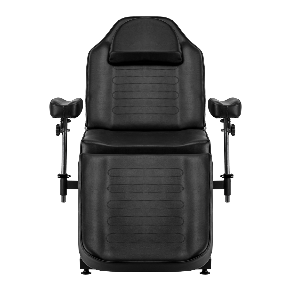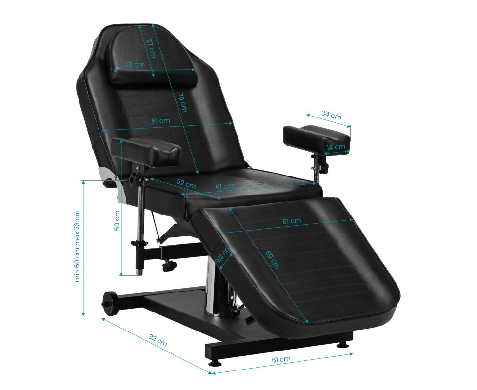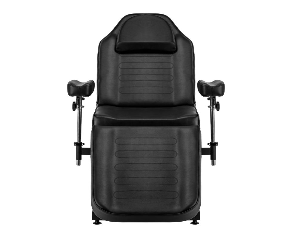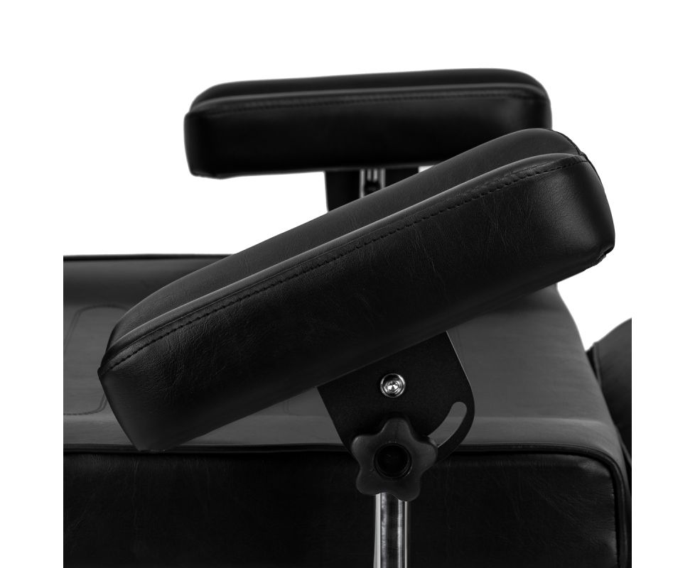 The chair is equipped with a hydraulic actuator that allows for smooth height adjustment from 60 to 73 cm. Both the backrest and footrest have a manual angle adjustment, allowing for a customized positioning to suit the type of procedure being performed. The movable, recessed armrests are easy to remove and adjust. They allow for angle, height, and tilt adjustment, providing comfortable, stable support and even greater freedom of work for the tattoo artist. All of these features increase client comfort and facilitate precise tattooing.
