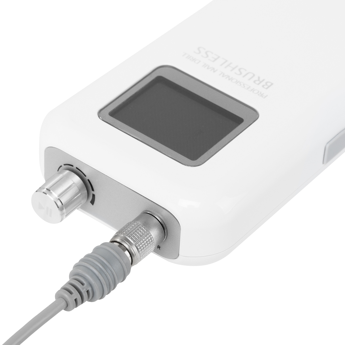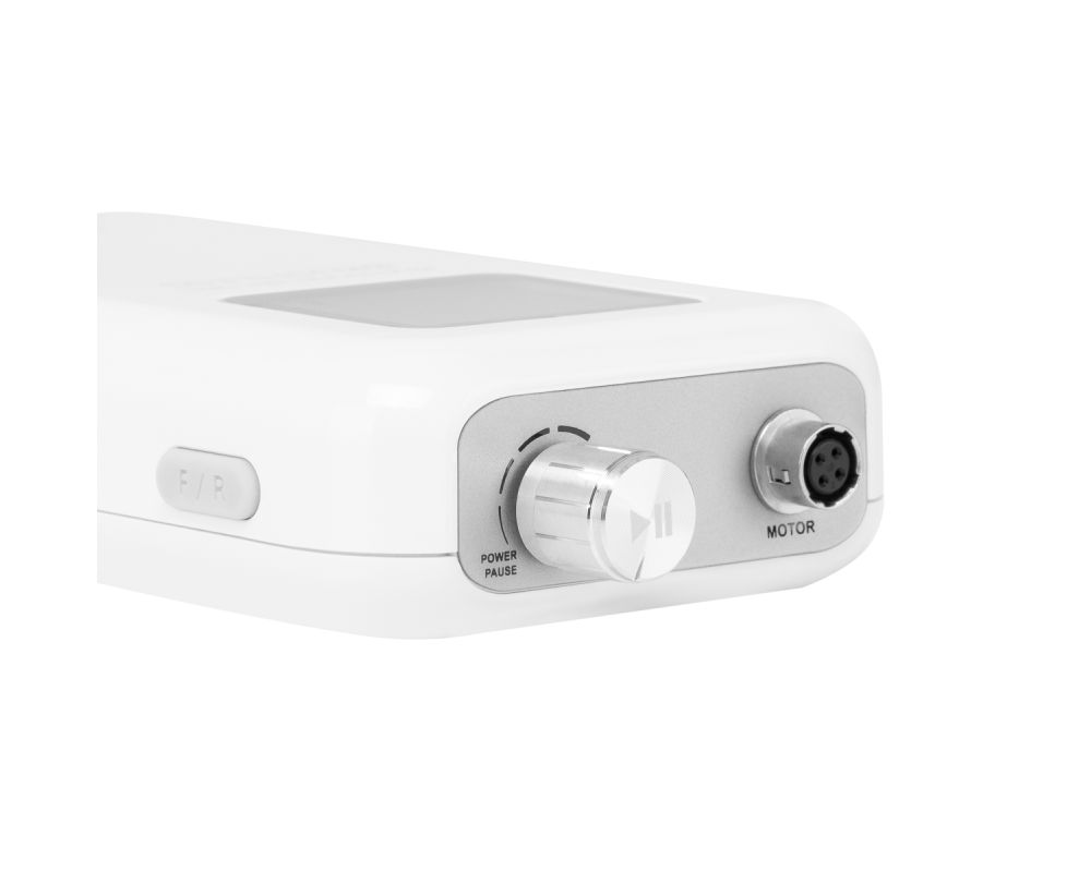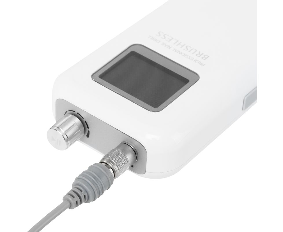 The knob allows for smooth adjustment of the speed of the head, reaching up to 35,000 revolutions per minute, allowing for easy customization and comfort during different treatments. Pressing the knob allows you to immediately stop and resume the device (pause function), which gives you full control over the workflow. Practical buttons located on the sides allow quick switching to the foot drive and changing the direction of rotation, which additionally makes it easier to adapt the device to various services. The display shows information about the direction of rotation, battery status, foot drive activation, and active pause. Additionally, the device is equipped with overload protection, which protects the motor from overheating, ensuring greater safety of work and longevity of the equipment.