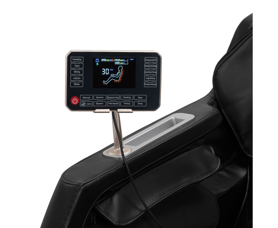 The easy-to-read LCD screen and clear button layout make using the chair intuitive and convenient. The panel can be placed in the holder on the right armrest or held in the hand, which provides full freedom of control. The display presents information about the currently massaged body part,  intensity, session duration and the selected massage program. The user can adjust the position of the chair, select a massage mode and set the session duration: 15, 20, 25 or 30 minutes.